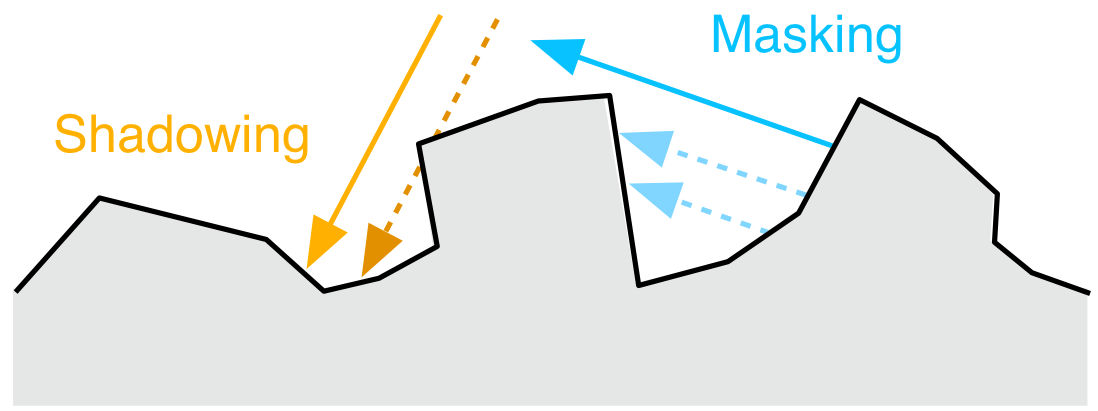 노멀 방향이 $\mathbf{h}$와 일치(정렬)하는 미세면이 얼마나 분포되어 있는지를 계산한다. - $G$ (Geometry):