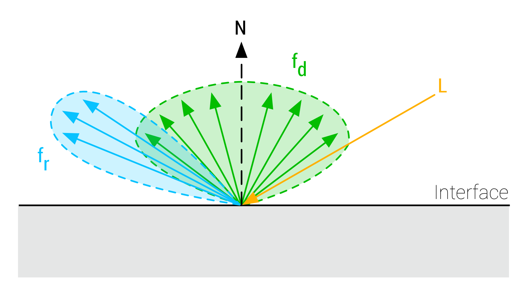 따라서, BRDF는 위 이미지처럼 내부에서 확산되어 나오는 빛은 $f_{d}$(Diffuse), 표면에서 반사되는 빛은 $f_{r}$(Specular)로 나누어서 다룰 수 있다.